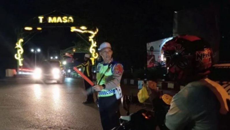 Petugas Polres Tapin Polda Kalimantan Selatan mengatur arus lalu lintas guna mengantisipasi arus balik jamaah Haul Syekh Muhammad Zaini Abdul Ghani atau Guru Sekumpul dari Martapura, Kabupaten Banjar yang melintasi Rantau, Kabupaten Tapin, Minggu (14/1/2024). ANTARA/M Fauzi Fadilah