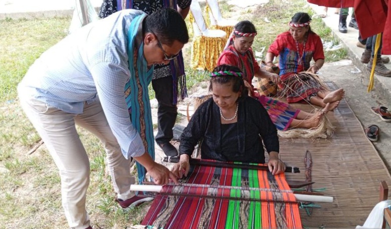 Kepala DPMPD Kaltim Puguh Hardjanto berbincang dengan perajin tenun tradisional di Kampung Muara Tae, Kecamatan Jempang Kutai Barat, Kaltim, Kamis (26/9/2024) (ANTARA/ M Ghofar)