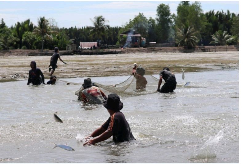 Petambak sedang gotong royong panen ikan di tambak kawasan mangrove di Kampung Pegat Batumbuk, Kabupaten Berau (Antara/ HO YKAN)
